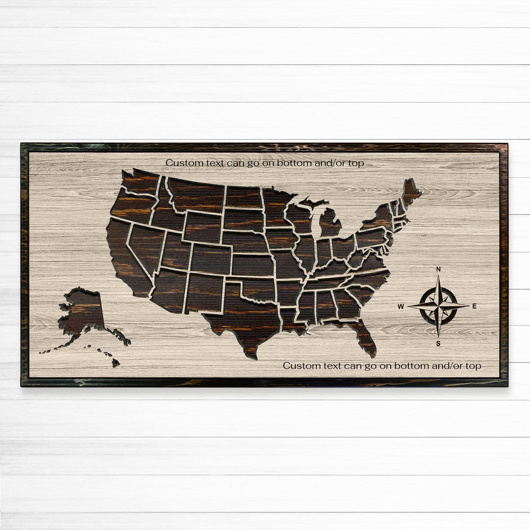 Push Pin Map of USA Carved Wood Map Wall Art Compass